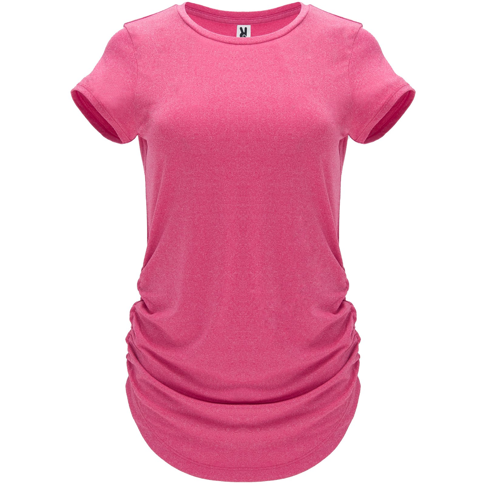 Camiseta técnica multi-deporte de manga corta para mujer. Tejido poliéster tacto algodón. Cuello redondo del mismo tejido. Laterales elásticos fruncidos para mejor adaptación al cuerpo. Corte entallado y largo especial.