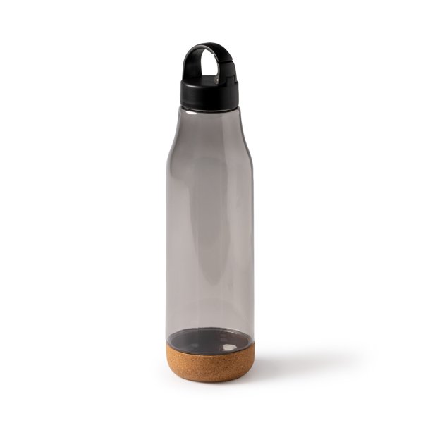 Botella con cuerpo de RPET y base de corcho. Asa de transporte con función mosquetón en la tapa, para facilitar su transporte. Capacidad 720 ml. Su base de corcho evita el deslizamiento del bidón en superficies. Una opción ligera y práctica para el transporte de bebidas y líquidos.