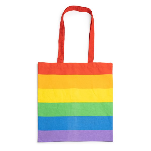 Bolsa 100% algodón de 180 g/m² con acabado multicolor. Asas largas reforzadas de 70 cm.