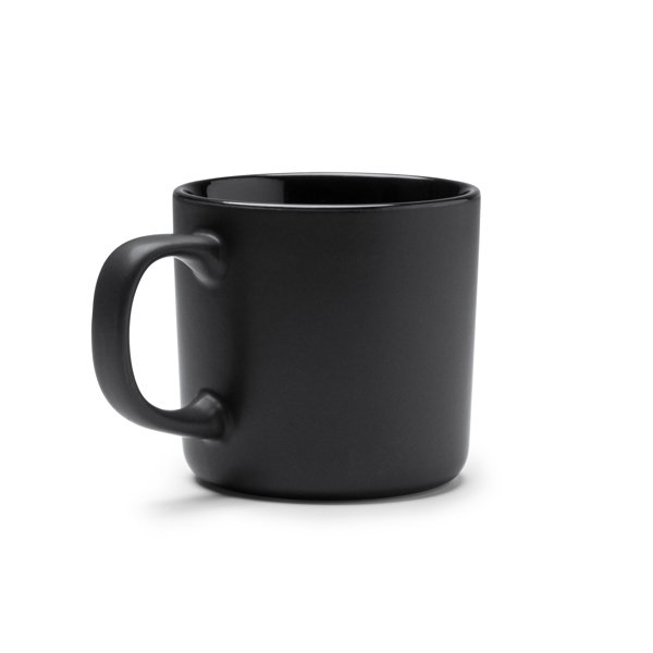Taza compacta de cerámica con acabado mate. Capacidad 300 ml. La parte interior es del mismo color que el cuerpo exterior, al igual que el asa. Un diseño uniforme y elegante, a la vez que práctico.