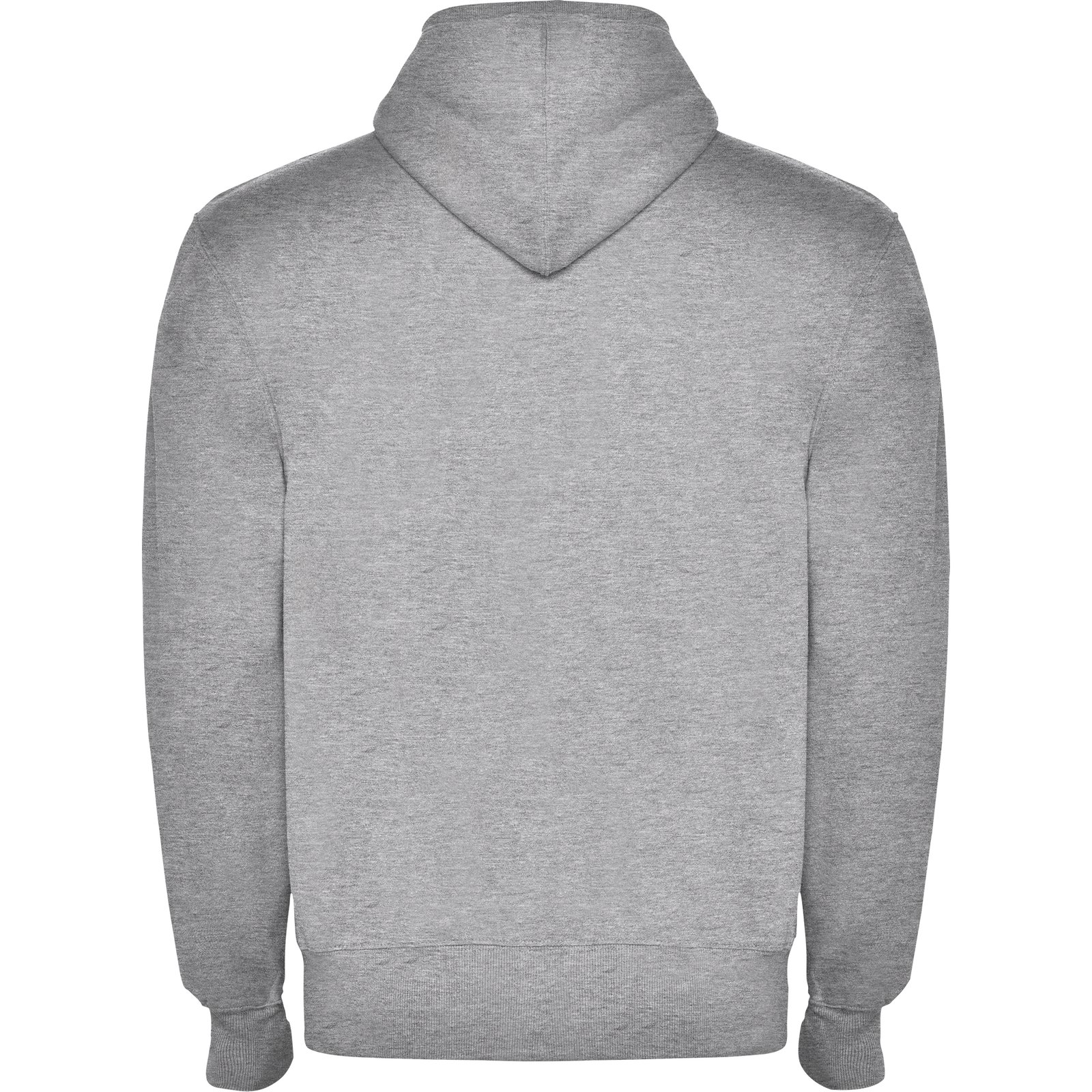 Sudadera unisex con cremallera frontal y capucha. Cremallera al tono. Bolsillos canguro, contorno capucha, puños y cinturilla en canalé 2×1 con elastano. Cubrecosturas del mismo tejido.