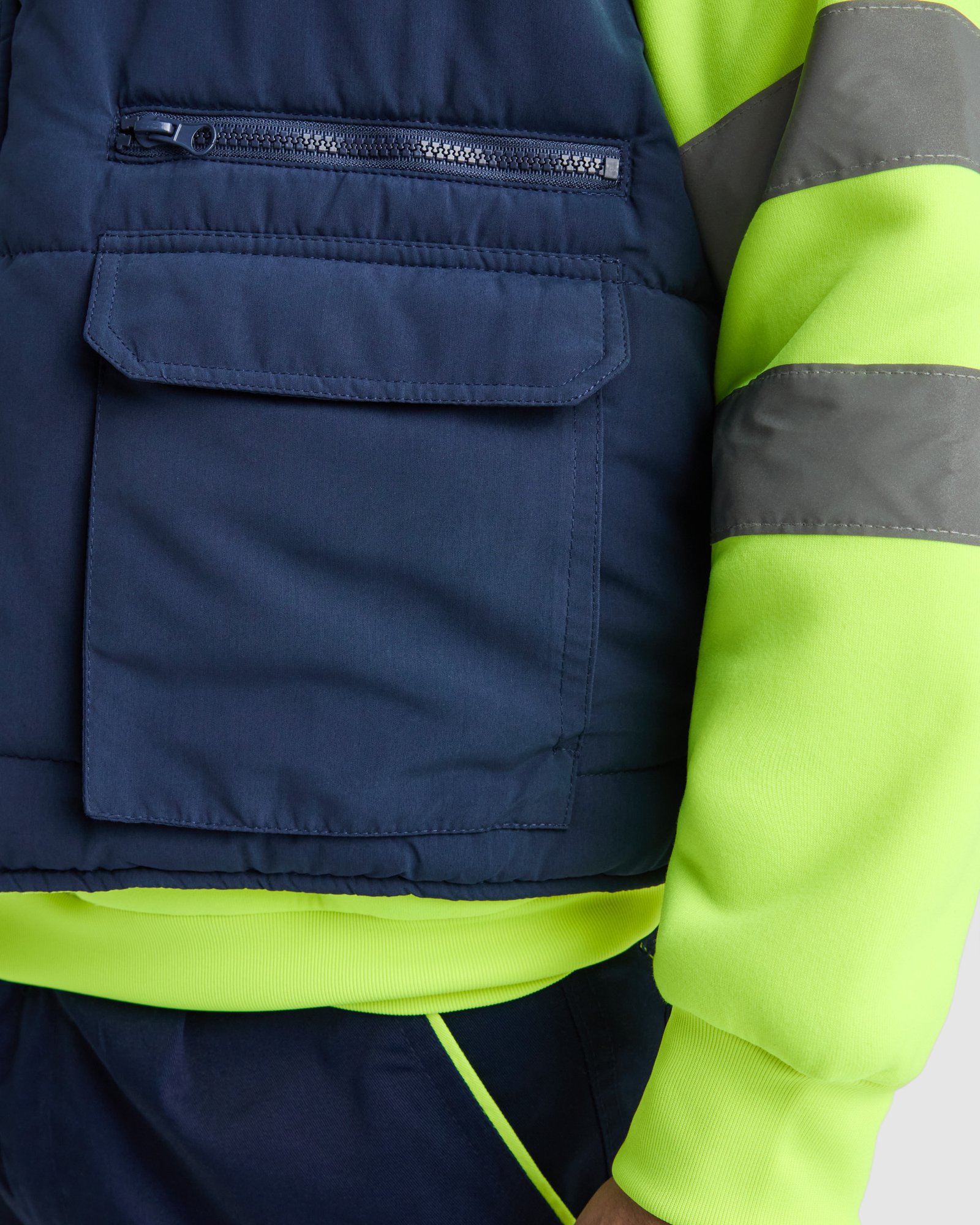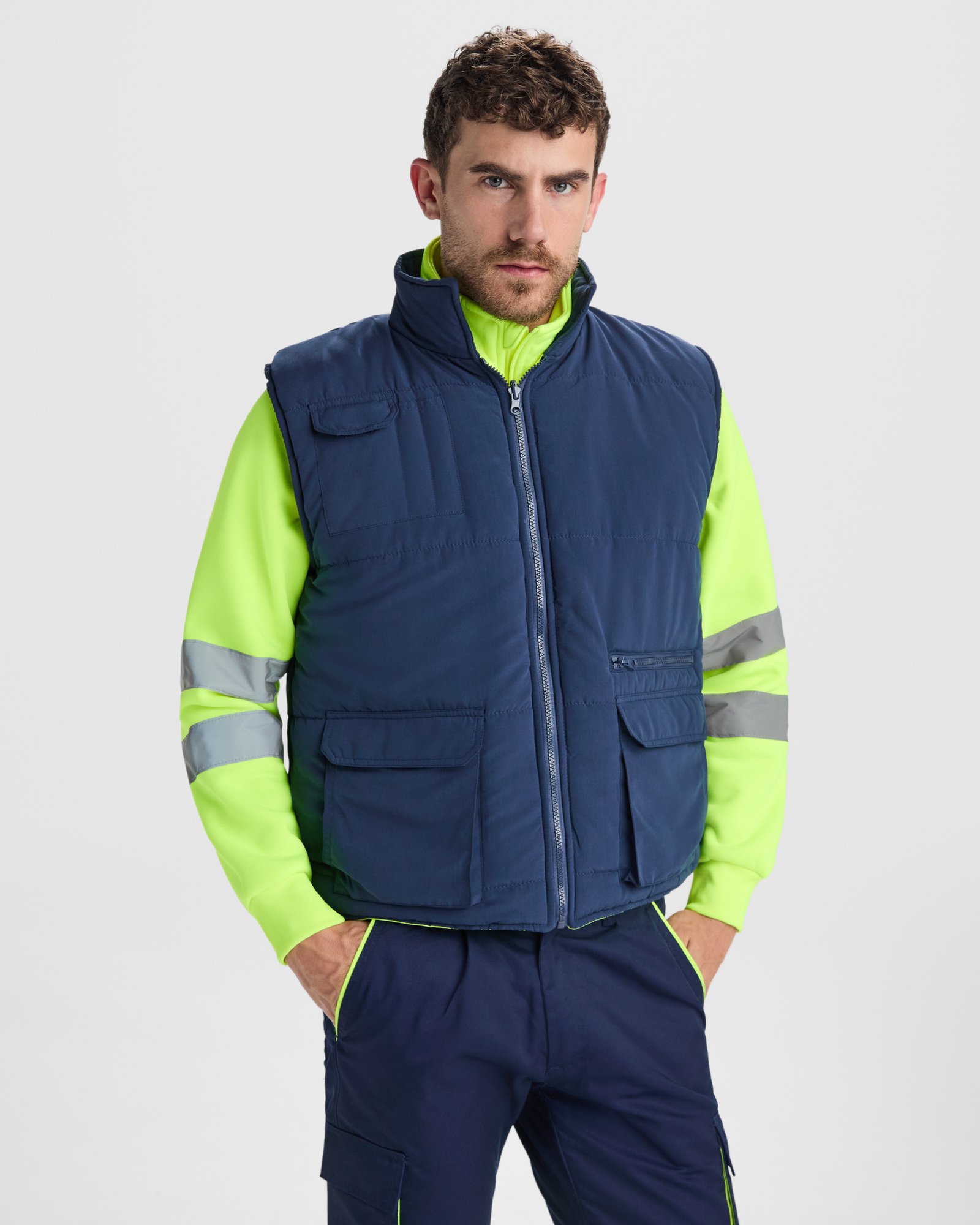 Chaleco alta visibilidad acolchado multibolsillos reversible con faldón trasero.