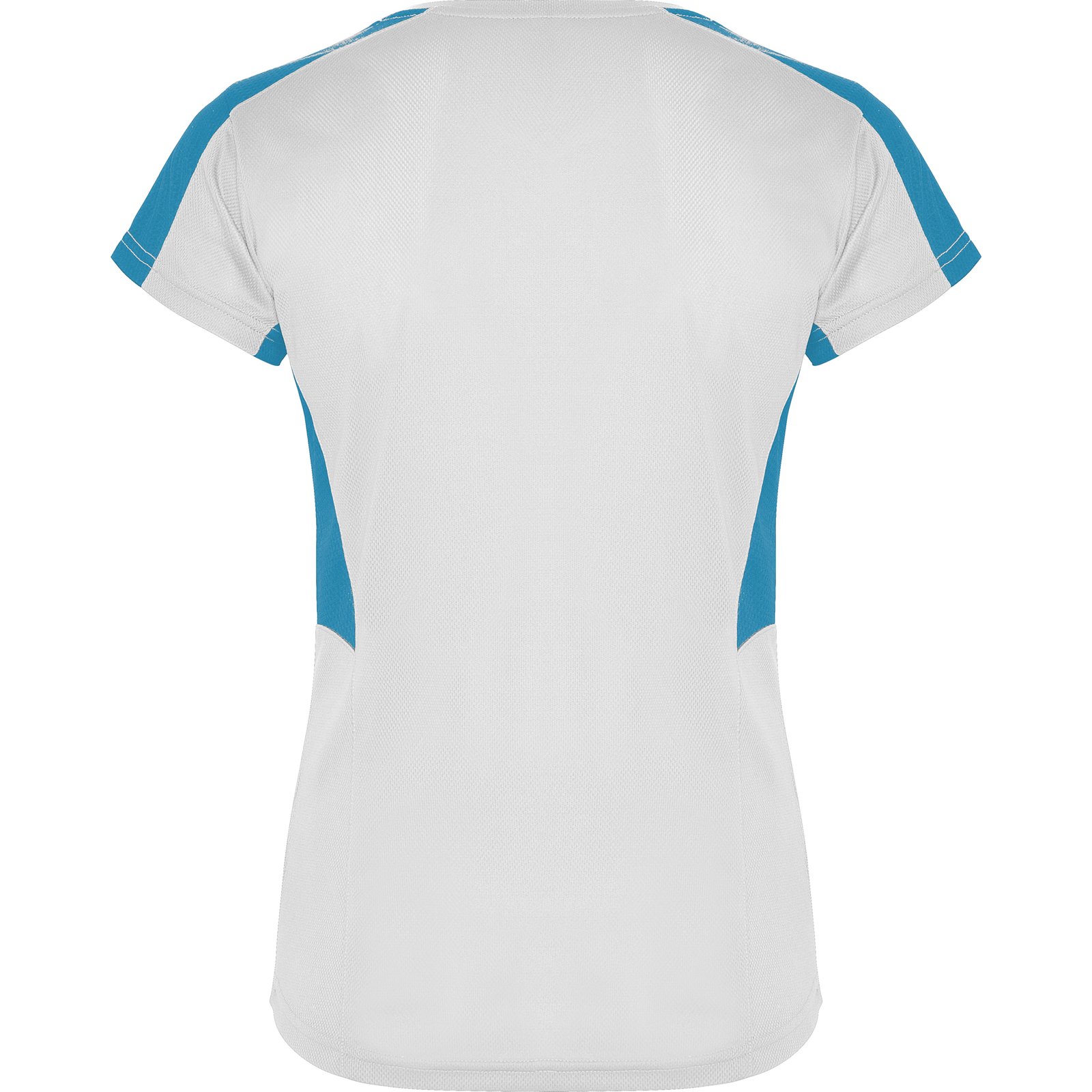 Camiseta técnica de manga corta para mujer con cuello pico. Combinada en laterales y hombros con dos tejidos de poliéster. Tejido principal bird´s eye y tejido rejilla 3D transpirable en hombros y paneles laterales. Tejido preparado para la absorción de humedad.
