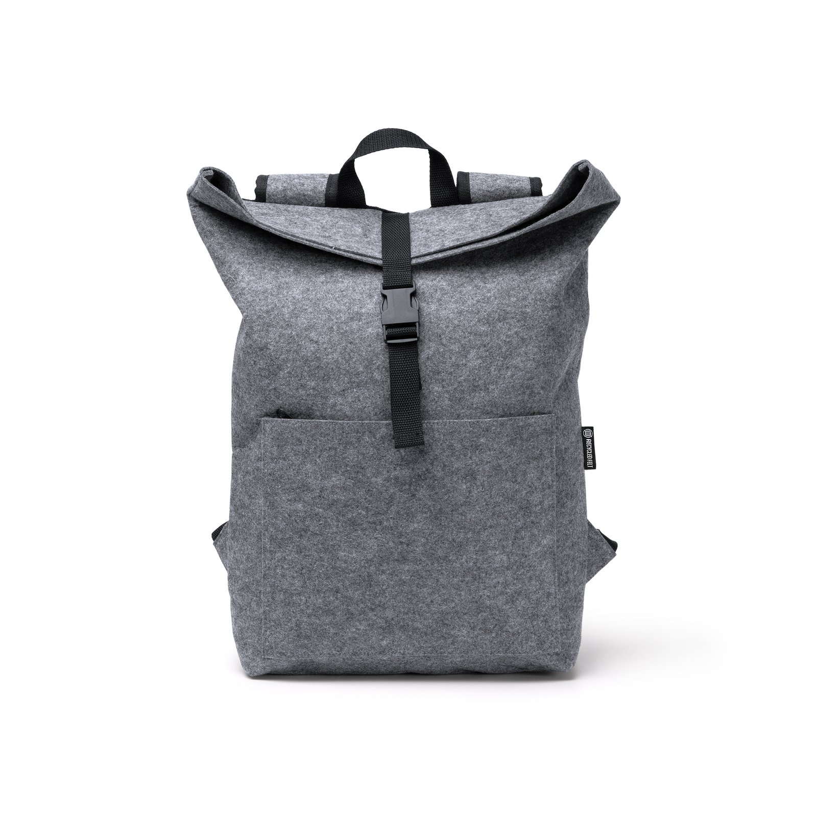 Mochila con solapa elaborada en fieltro reciclado. Cuenta con mosquetón para cierre del compartimento principal, bolsillo frontal para guardar pequeñas pertenencias y asas ajustables.