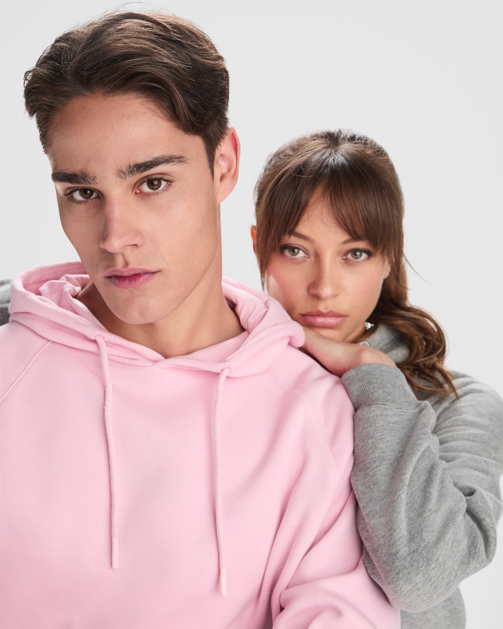 Sudadera unisex con capucha forrada. Algodón orgánico peinado. Manga ranglán. Puños y cinturilla en canalé 2×1 con elastano. Cubrecosturas del mismo tejido. Cordón plano en capucha. Ojales bordados al tono. Certificado OCS y GRS.